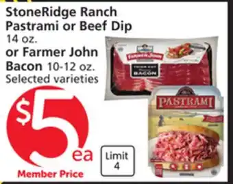 StoneRidge Ranch Pastrami or Beef Dip 14 oz. or Farmer John Bacon 10-12 oz