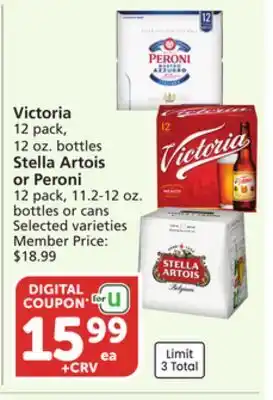 Victoria 12 pack, 12 oz. bottles Stella Artois or Peroni 12 pack, 11.2-12 oz. bottles or cans Deal at Vons