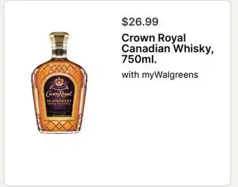 The price of Crown Royal Canadian Whisky, 750ml can be found at the top of the page, together with the dates during which the offer is available. You can also check the price in the current Walgreens weekly ad or on the Walgreens website. Promotional offers assure you of buying Walgreens products at the lowest price.