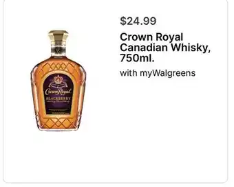 Walgreens offers a wide collection of products, besides the Crown Royal Canadian Whisky, 750ml. Keep an eye on the weekly Walgreens weekly ad to find the best offers and promotions. Besides Crown Royal Canadian Whisky, 750ml, you can also find the following offers: Crown Royal Whisky, Crown Royal whisky & Crown Royal Regal Apple, Peach or Whisky.