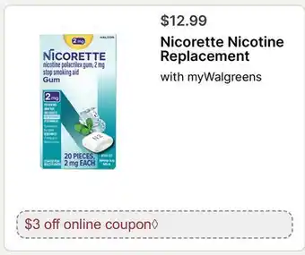 This Nicotine Replacement is now on deal at Walgreens. All information about current prices, promotional conditions, and durations can be found on this page. Also check out other comparable deals and promotions related to Nicotine Replacement, so you can always make the most cost-effective choice.The duration of the Nicotine Replacement deal is from 25-01-2026 to 31-01-2026. If the deal is no longer valid, you can look at other comparable offers. You can also follow the product category to stay informed as soon as Nicotine Replacement is on deal again at Walgreens. By comparing Nicotine Replacement deals, you'll know whether it's wise to wait on a purchase because it might have been cheaper or might come up cheaper in a future deal. So keep an eye on our site to see if Nicotine Replacement appears next week with a significant discount in the flyer.