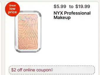 The price of NYX Professional Makeup can be found at the top of the page, together with the dates during which the offer is available. You can also check the price in the current Walgreens weekly ad or on the Walgreens website. Promotional offers assure you of buying Walgreens products at the lowest price.