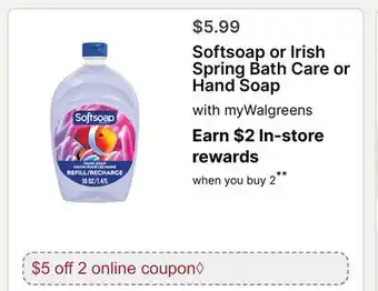 Softsoap or Irish Spring Bath Care or Hand Soap deals and online offers from the current Walgreens weekly ad