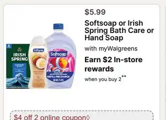 Softsoap or Irish Spring Bath Care or Hand Soap Discount at Walgreens