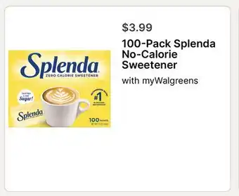 Walgreens offers a wide collection of products, besides the Splenda No-Calorie Sweetener. Keep an eye on the weekly Walgreens weekly ad to find the best offers and promotions. Besides Splenda No-Calorie Sweetener, you can also find the following offers: 100-Pack Splenda No-Calorie Sweetener, Splenda Zero Calorie Sweetener Packets & Truvia Natural Sweetener.