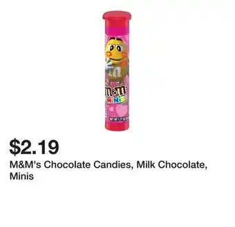 This offer is available in various stores, view all products to get the cheapest M&M's Chocolate Candies, Milk Chocolate, Minis. If you'd like to find out whether this product has a bigger discount in another store, check the category 'Drugstores'. You may also find these offers interesting: M&M's Chocolate Candy, Mars Minis, M&M's or Dove Share Size Chocolate & Valentine M&M's Minis Tube 1.08oz.
