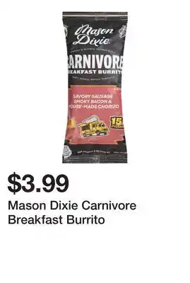 In which store will Mason Dixie Carnivore Breakfast Burrito be on sale next week? These are some of the questions we get asked a lot. It’s only normal, nobody likes to pay too much! Our team keeps an eye on all deals and lists them online as soon as possible. So you can customize your (shopping) list with this week's offers and those of next week. Make sure to check next week’s Wegmans ad, some of the specials are only available next week or online.Frequently asked questions about Mason Dixie Carnivore Breakfast Burrito