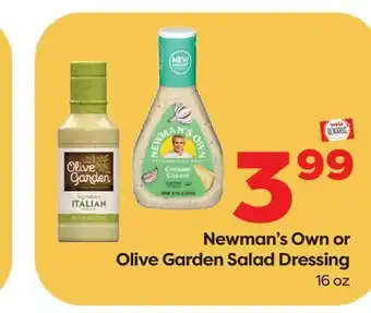 The price of Newman's Own or Olive Garden Salad Dressing can be found at the top of the page, together with the dates during which the offer is available. You can also check the price in the current Weis Markets weekly ad or on the Weis Markets website. Promotional offers assure you of buying Weis Markets products at the lowest price.